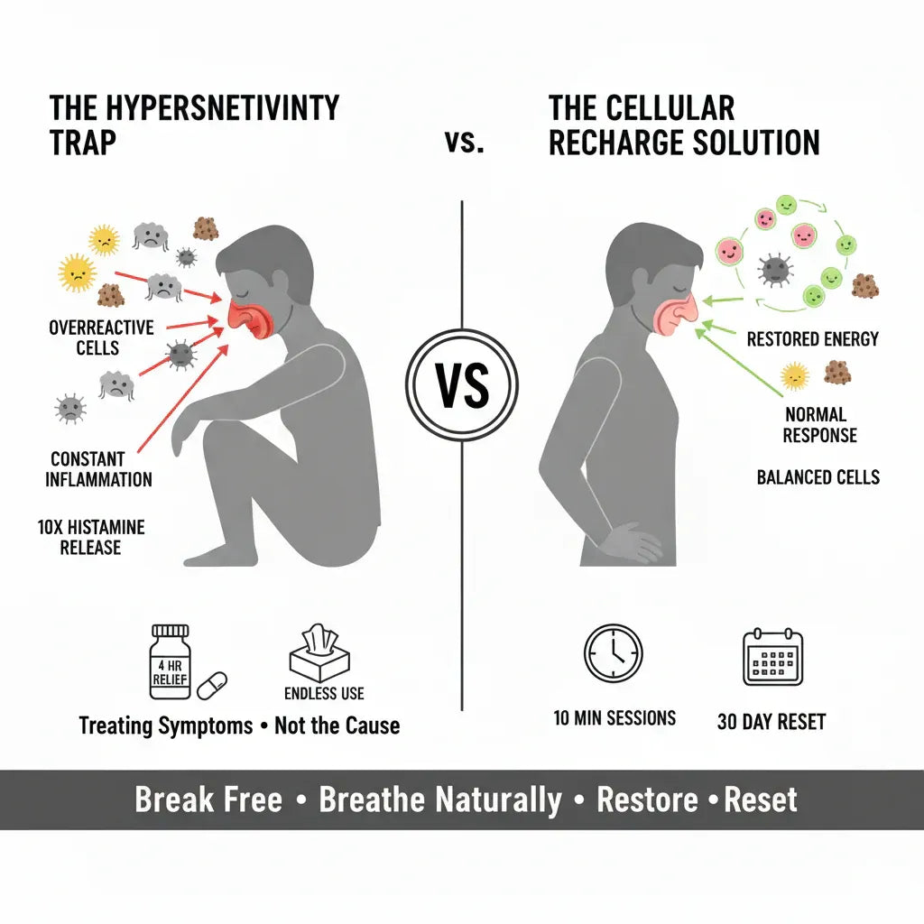 Medical-grade red light penetrates nasal tissue to reduce inflammation and improve airflow. No chemicals, no rebound effect, no side effects.